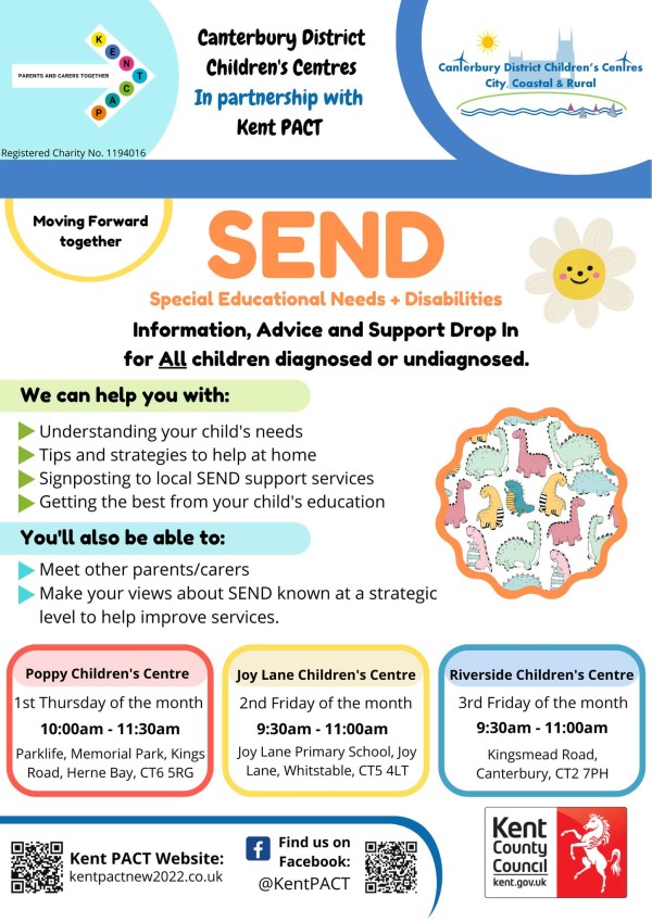 We will be at the Joy Lane Children's Centre drop in on Friday 10th November along with the SEND Information Hub and Kent PACT - Parents and Carers Together, come along and join us!